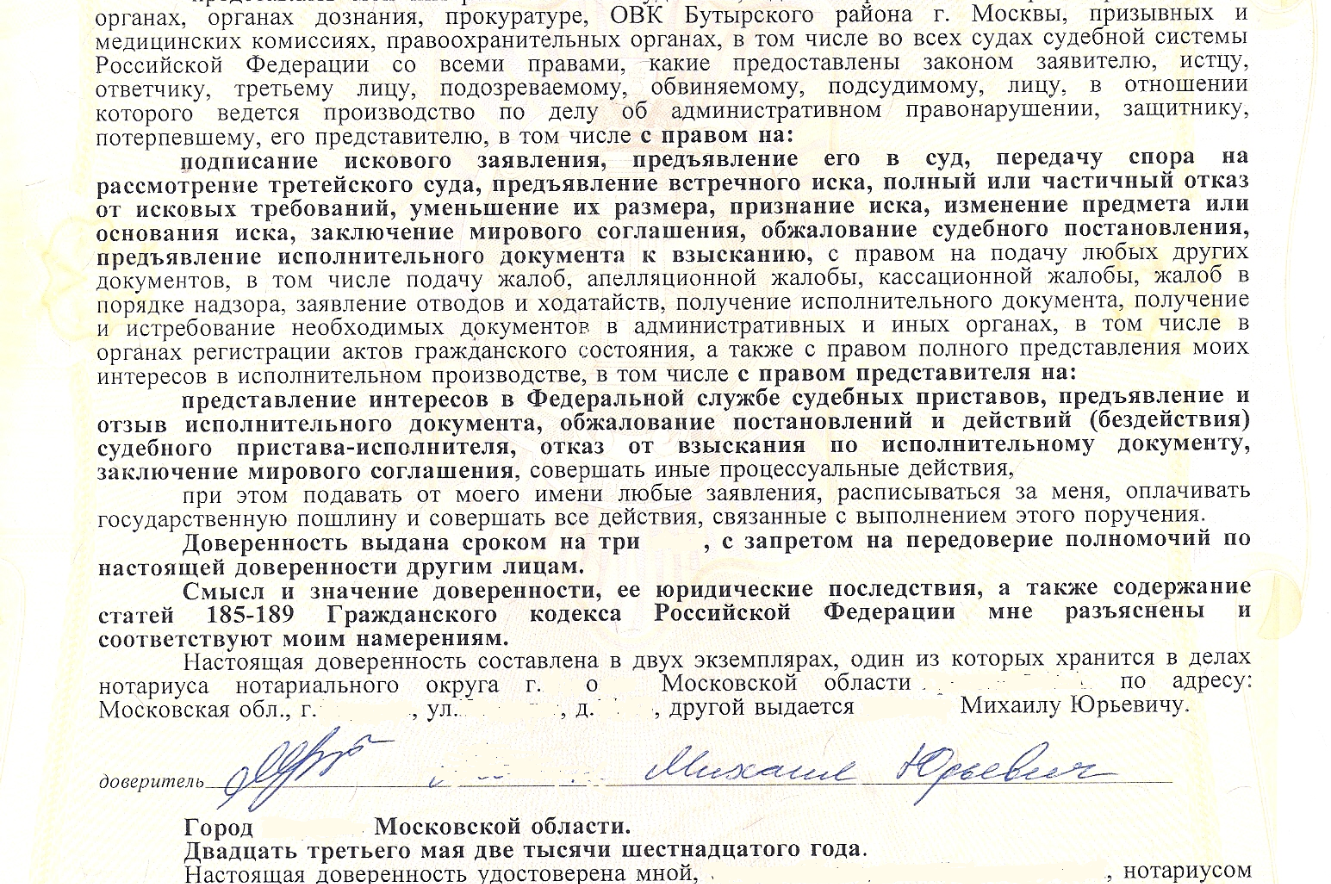 Следующий шаг - заключение официального договора о юридической помощи. Оформляем нотариальную доверенность для представления интересов доверителя юристом в государственных органах.